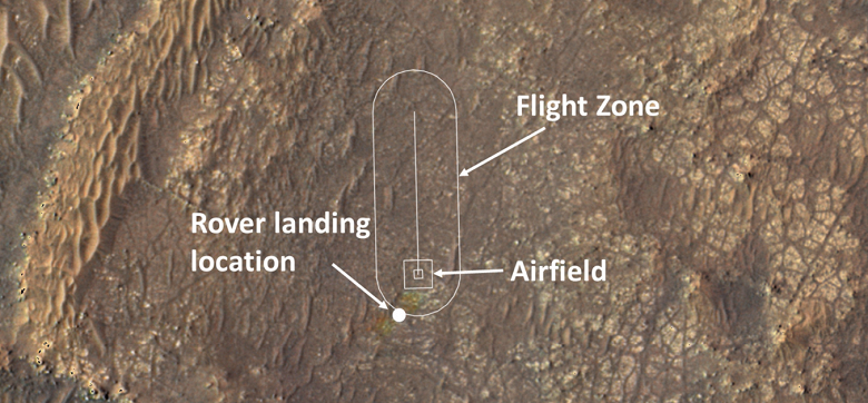 Сейчас аппарат спрятан в специальном отсеке марсохода в его днище. Несколько дней назад Perseverance сбросил специальный щит, защищавший этот отсек. Теперь марсоход находится на пути к импровизированному аэродрому — ровной площадке размером примерно 10 х 10 м.