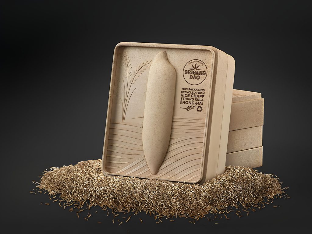 В сфере упаковки шелуха превращается в биоразлагаемые контейнеры и коробки, полностью перерабатываемые и пригодные к повторному использованию, как, например, оригинальная упаковка для риса Srisangdao, которая после опустошения может служить бытовым контейнером.