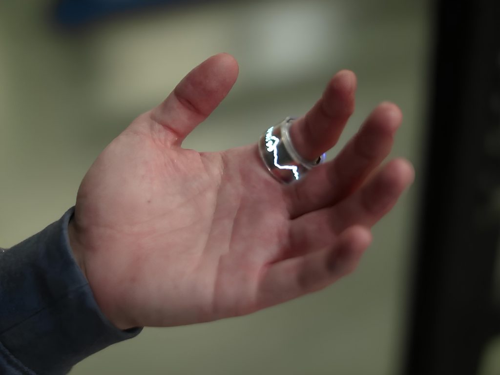 Исследователи из Университетов Штутгарта и Пельсильвании представили прототип «умного» кольца VisRing — миниатюрного гаджета с гибким OLED-дисплеем, который полностью оборачивается вокруг пальца. Такой подход позволяет считывать данные, не отвлекаясь на смартфон или часы, — достаточно лишь взгляда.
