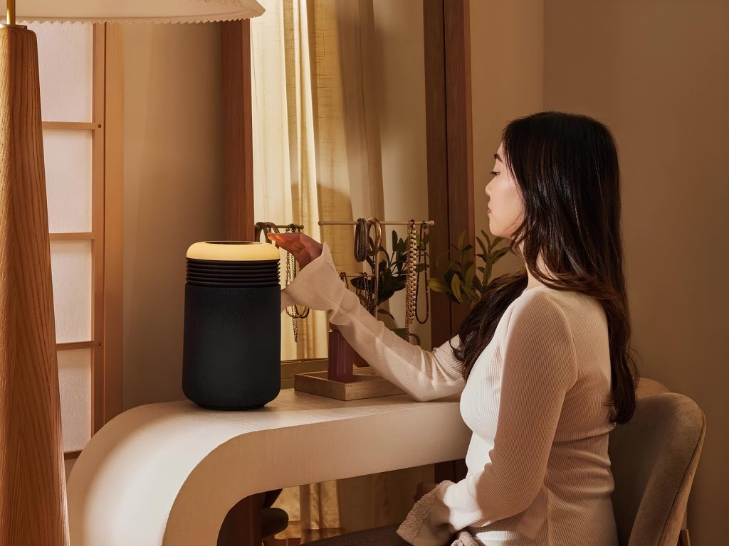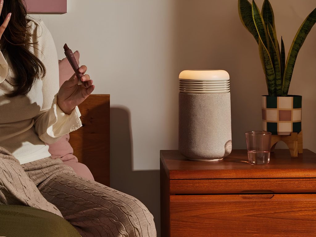 Небольшой цилиндр с тканевой отделкой очищает воздух, мягко подсвечивает комнату, помогает просыпаться с «рассветом», проигрывает звуки для засыпания, показывает время и подзаряжает смартфон, при этом оставаясь визуально аккуратным элементом интерьера.