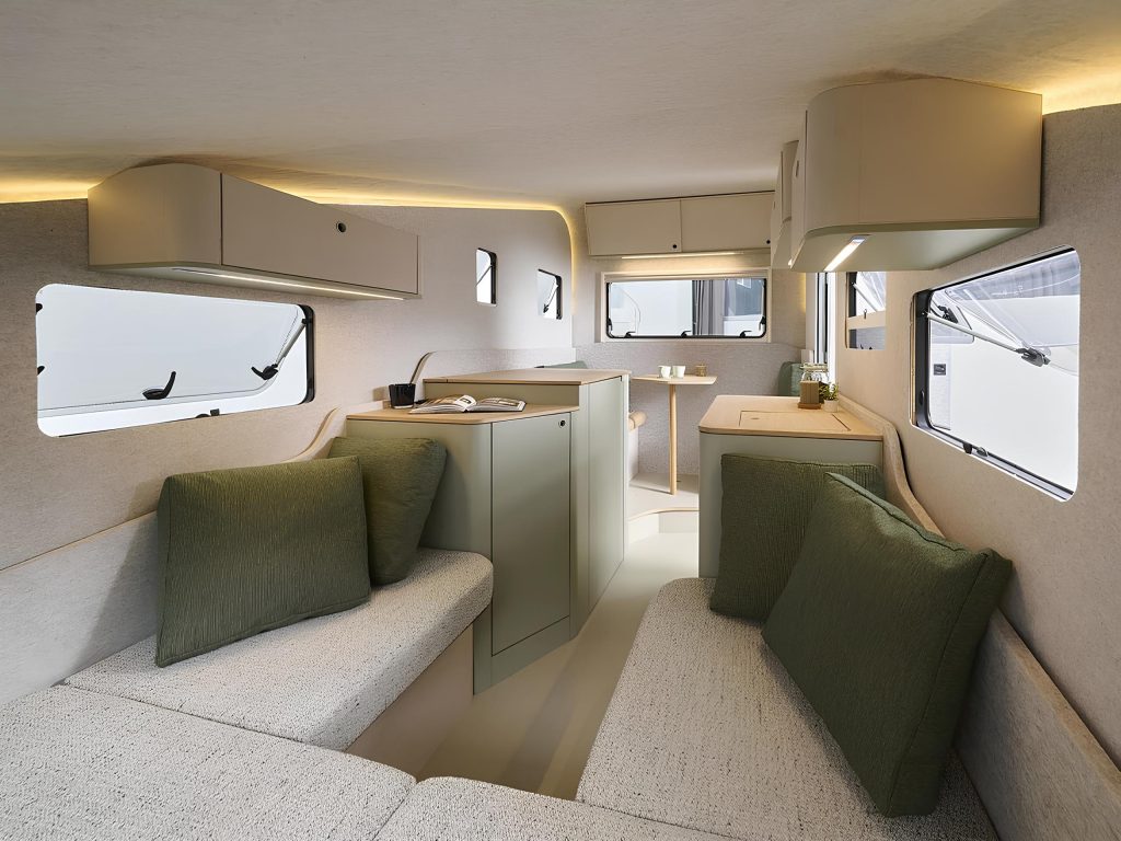 Стены выполнены из переработанных ПЭТ-бутылок, на полу — линолеум. Входная зона может трансформироваться — при путешествии в одиночку сиденья убираются, освобождая место для двух электровелосипедов или спортивного снаряжения. Для автономных поездок предусмотрены солнечные панели на крыше, аккумулятор на 300 А/ч, инвертор мощностью 2 000 Вт и переносная индукционная плита, которую можно использовать как внутри, так и снаружи.