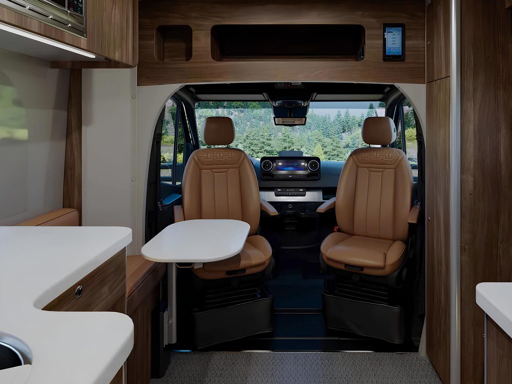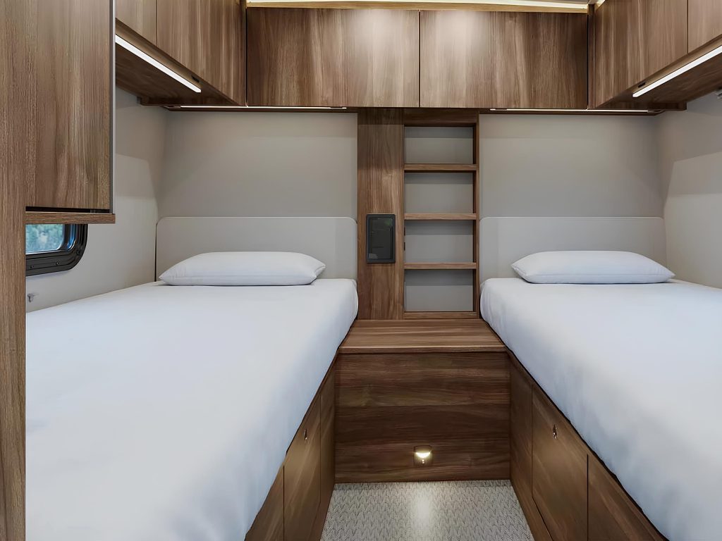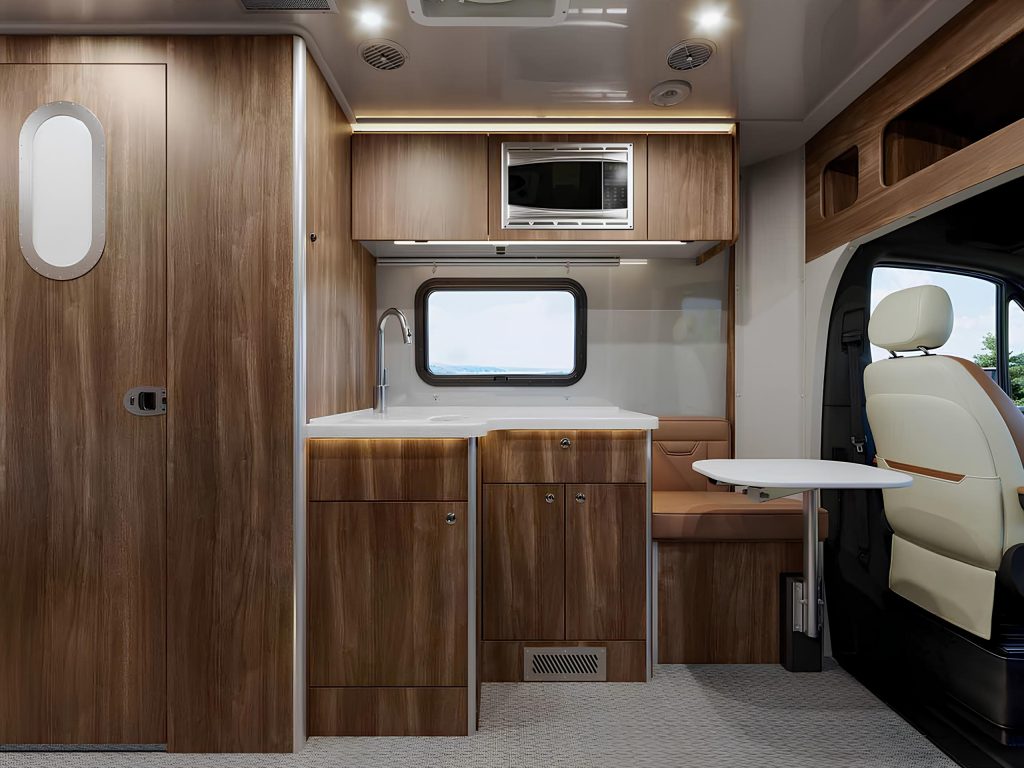 Внутреннее пространство организовано максимально рационально: здесь удобно готовить, отдыхать и жить без ощущения тесноты. Сразу при входе располагается кухня с продуманными системами хранения и современным оснащением, а тёплая отделка и качественные материалы создают ощущение уюта. Индукционную плиту можно спрятать в выдвижной отсек, освобождая рабочую поверхность, что особенно удобно для общения или отдыха. Управление функциями автодома — освещением, климатом и другими системами — осуществляется через мультиплексную систему Garmin, а за звук отвечает аудиосистема JBL с сабвуфером.