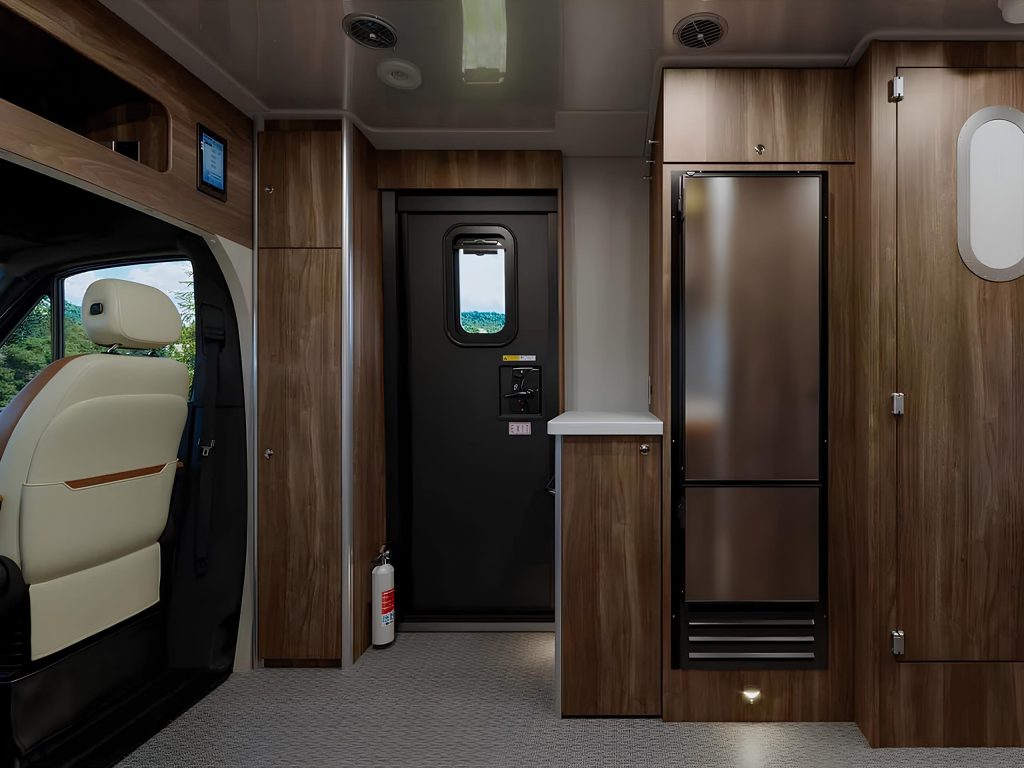 Планировка рассчитана на двух человек и включает отдельную спальную зону с удобной кроватью и встроенными местами для хранения. Одной из ключевых особенностей стала раздельная ванная зона: душевая кабина и туалет с раковиной находятся в разных секциях, что повышает комфорт в дороге. Рядом размещён полноценный холодильник, а задняя часть салона превращается в приватное пространство для отдыха.