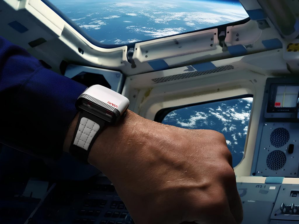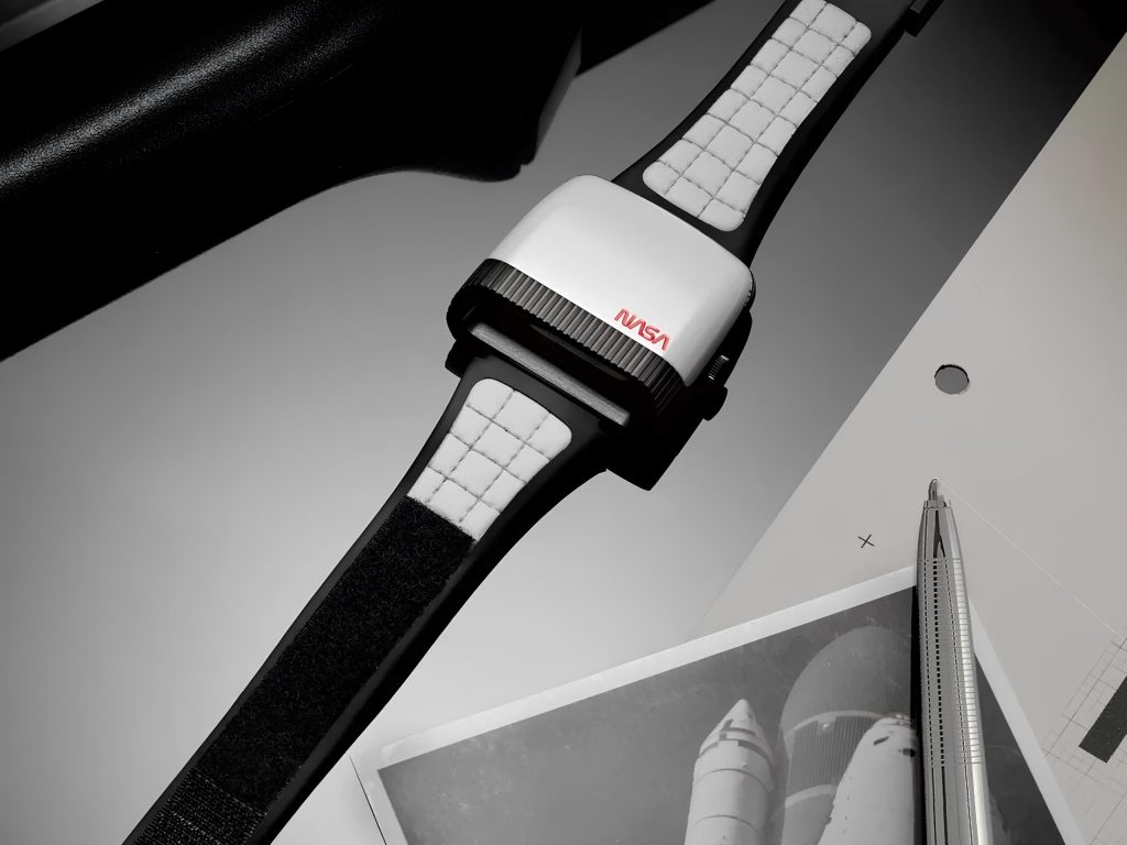 Новая интерпретация сохраняет ключевую особенность оригинала — необычное расположение циферблата, ориентированного перпендикулярно запястью, что делает считывание времени удобным во время вождения. Вместо привычного верхнего циферблата здесь размещён логотип NASA, а визуальная концепция отсылает к эпохе космических шаттлов. Дизайн сочетает ретро-футуристику с индустриальными мотивами: корпус выполнен в чёрном цвете с прочным покрытием, а верхняя часть дополнена керамическим элементом, вдохновлённым теплозащитными плитками космических аппаратов.