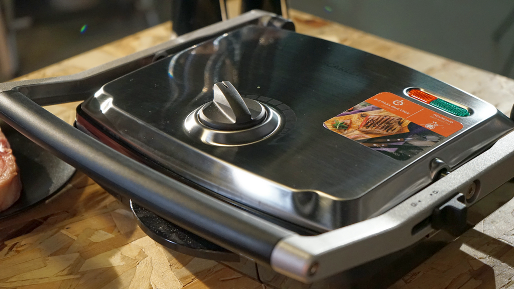 Мощности — до 1800 Вт — достаточно для приготовления стейков из говядины или других продуктов (желательно, чтобы мощность гриля была не ниже 1500 Вт). Есть регулировка уровня нагрева, а световая индикация подскажет, что гриль готов к работе. Угол наклона и высоту верхней пластины можно регулировать — чтобы готовить продукты разных размеров.