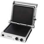 В этом гриле предусмотрен механический таймер — по прошествии заданного времени раздается звуковой сигнал (но нагрев не прекращается). Дополнительное удобство — обозначение времени и температуры приготовления различных продуктов на панели управления. Поворотный регулятор температуры — рядом с таймером. Мощность — до 1800 Вт.