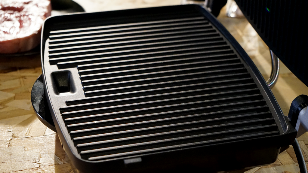 У гриля две рифленые нагревательные пластины с антипригарным покрытием. Они не съемные, но ухаживать за грилем не сложно — просто вытирайте пластины влажной тканью сразу после использования (когда гриль остынет). Есть и съемный поддон, куда стекает весь «лишний» жир с продуктов. Отличная максимальная мощность — 2200 Вт.