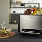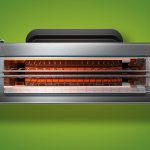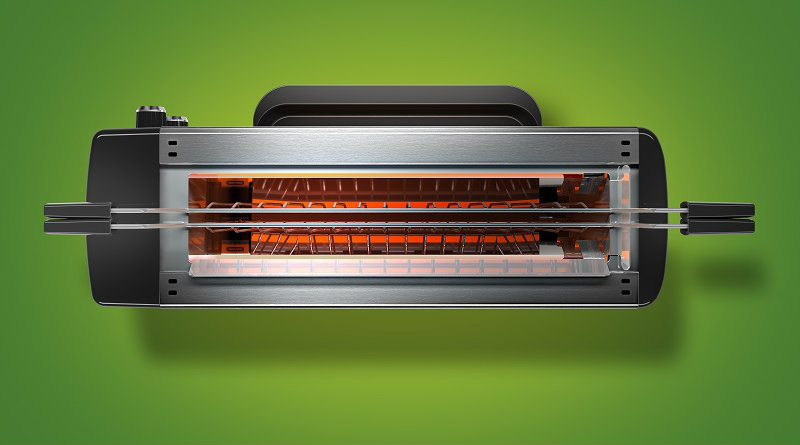 Специальная решетка в которую помещают продукты, вставляется в устройство вертикально, нагрев происходит с двух сторон (мощность — до 1300 Вт). Удобно, что можно регулировать интенсивность и время нагрева. Готовить в таком тостере-гриле можно самые разные продукты, от уже упомянутого поджаренного хлеба, до мяса, рыбы или овощей. Крошки или жир окажутся в съемном поддоне.