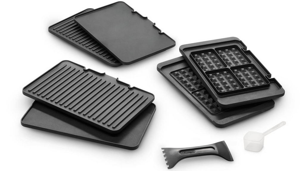 В комплекте шесть съемных пластин разных типов — по три для каждой из двух нагревательных поверхностей (это двухсторонний контактный гриль). Все пластины — с антипригарным покрытием. Такое разнообразие позволяет готовить стейки, бургеры, птицу, рыбу, морепродукты, овощи. Даже яичницу или вафли и оладьи — для этого все есть.