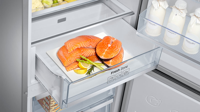 Есть зона свежести с авторегулировкой температуры (от 0°C до +3°C) и влажности для хранения мяса, рыбы, молочных продуктов. Они, по информации производителя, хранятся до трех раз дольше, а овощи так вообще до пяти раз.