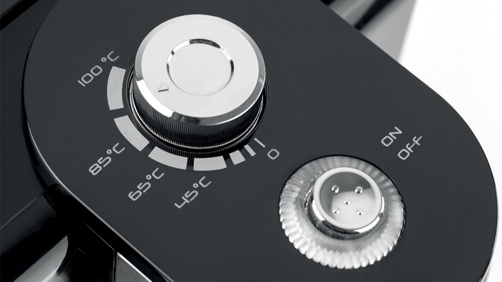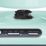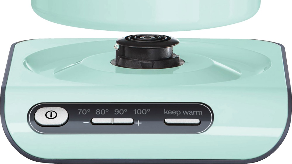 Электронное управление -выбирайте температуру воды: 70, 80, 90 или 100°С, для разного чая и других напитков. Есть поддержание нужной температуры — работает полчаса. База с центральным контактом позволяет устанавливать чайник любой стороной (поворачивается на 360°). Скрытый дисковый нагревательный элемент облегчает уход. Очень добротно сделанная модель, которую хочется иметь на кухне.