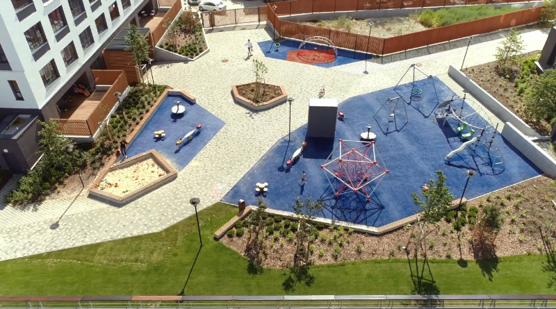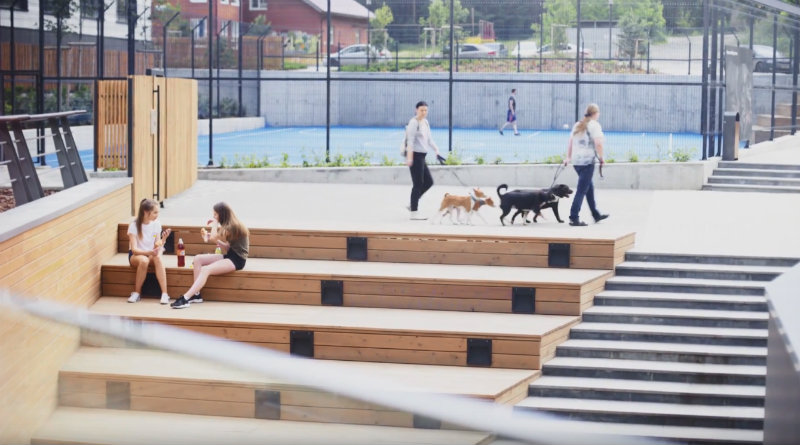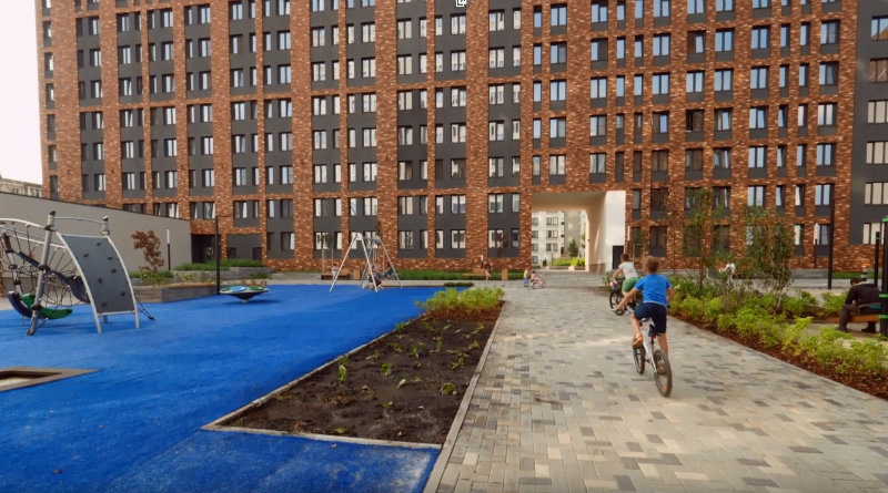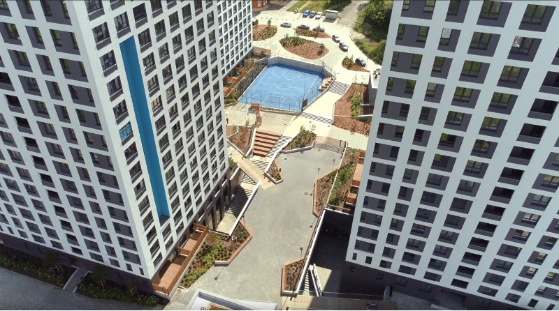 В ЖК «Каменный ручей» нас удивил внутренний двор, который находится на высоте девять метров! Есть как открытая территория снизу, так и закрытая — для того, чтобы попасть внутрь, нужно пройти через дверь с домофоном.