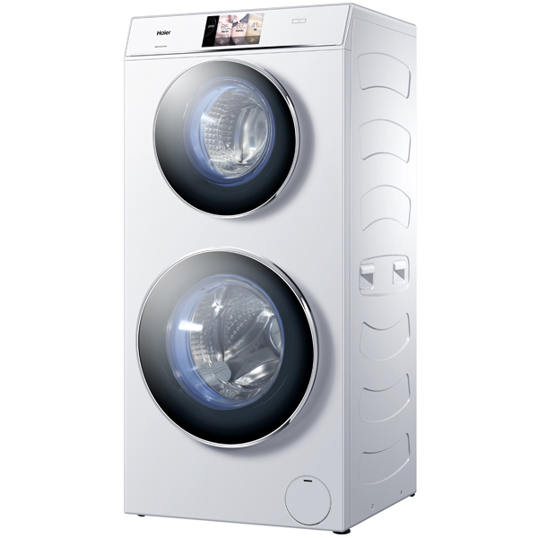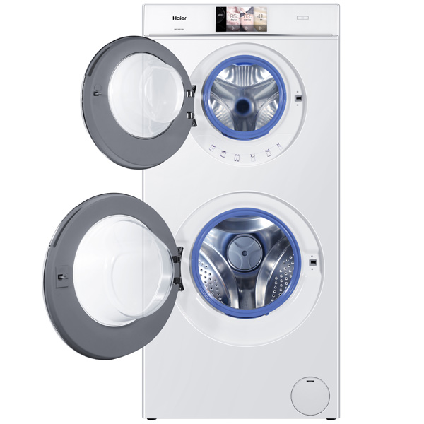 Габариты HAIER HWD120-B1558U (ширина×высота×глубина) — 60×128×60 см. Это стирально-сушильная машина с двумя инверторными моторами (оба с прямым приводом и пожизненной гарантией от производителя) и барабанами. Сверху — барабан с загрузкой до 4 кг, а снизу — до 8 кг. Всего — 12 кг. При этом для каждого барабана свой набор программ стирки — они независимы друг от друга. А в нижнем можно еще и сушить вещи (до 4 кг). Более того, можно в верхнем что-то стирать, а в нижнем в это время — сушить.