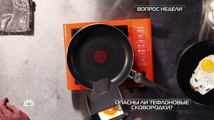 Кстати, в программе «Живая еда» мы тоже часто готовим — и знаем, что даже для жарки мяса не требуется более 200 градусов, а при таких температурах химики МГУ не нашли в тефлоновом покрытии ничего вредного. Перегреться выше нормы может разве что сковородка, забытая на плите. Мы смоделировали и такую ситуацию. Чтобы эксперимент был безопасным, в студии включили мощную вытяжку, а профессор надел респиратор. Уже через 2 минуты температура оказалась действительно критической — почти вся сковородка нагрелась до 350 градусов.