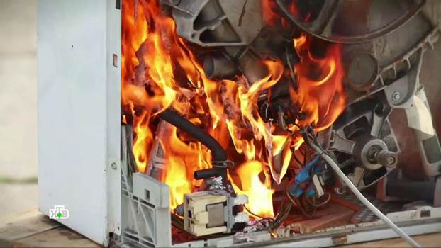 Далее эксперт моделирует неисправность в двигателе и демонстрирует, как летят искры. Они могут появиться и в местах контакта проводов, если те разболтаются от вибрации. Следующий опыт: эксперт выводит из строя терморегулятор нагревательного элемента. Тепловизор фиксирует, что температура растет, уже больше 100 градусов. Нагревательный элемент, вопреки ожиданиям, не перегорел от перегрева, а продолжил набирать температуру. Как итог — стиральная машинка вспыхнула!