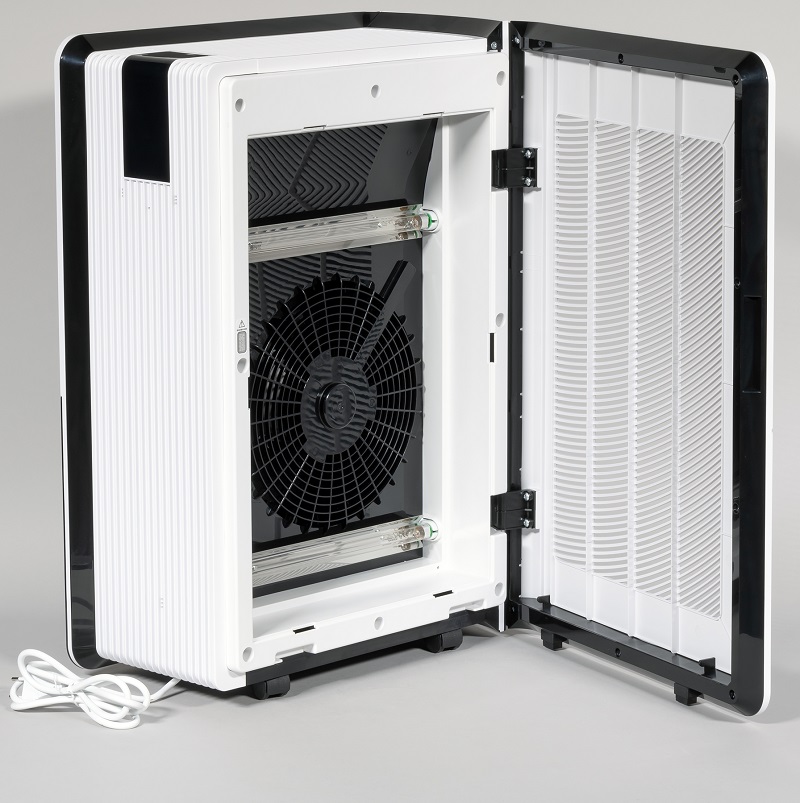 Процесс фотокатализа запускается ультрафиолетом. Здесь стоят две хорошие УФ-лампы Philips с правильной длиной волны — 254 нанометра. Это как раз та длина, при которой ультрафиолетовое излучение обладает наибольшими бактерицидными, обеззараживающими свойствами. И получается, что ультрафиолет работает и на фотокатализ, и на обеззараживание — обеззараживаются и проходящий через очиститель воздух, и внутренности гаджета (даже на загрязненных фильтрах не будут накапливаться ненужные бактерии).