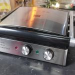 Как и предыдущего гриля, в этой модели есть фиксатор крышки, позволяющий регулировать ее высоту — прижимать продукты до конца или не совсем. То есть получается, что этот трудяга может работать и как классический гриль, и как электрическая сковородка, и как вафельница, и еще как мини-печь. Вот такая многофункциональность.
