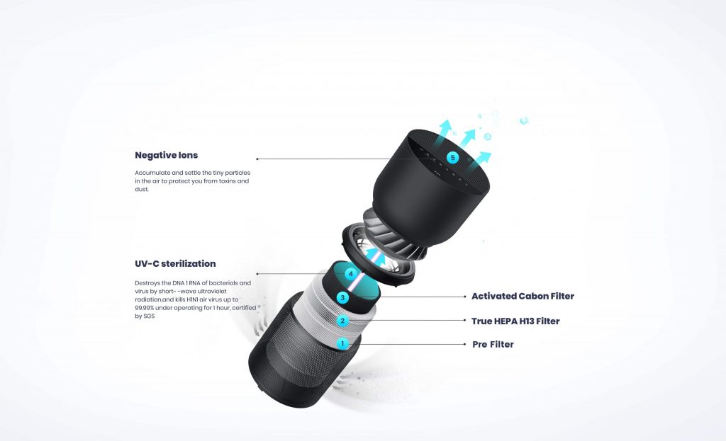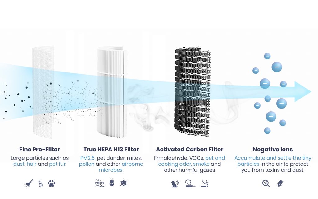 Воздухоочистители оснащены сменными гипоаллергенными фильтрами HEPA 13. Они удерживают 99,97% пыли, что позволяет делать воздух в комнате чище. Система двойных лазерных сенсоров для определения микроскопических частиц размером 0,3 микрона (0,0003 мм) помогает очищать воздух даже от сигаретного дыма и запахов животных. Очистители поглощают мелкие частицы и негативные ионы, тем самым очищая воздух от микробов.