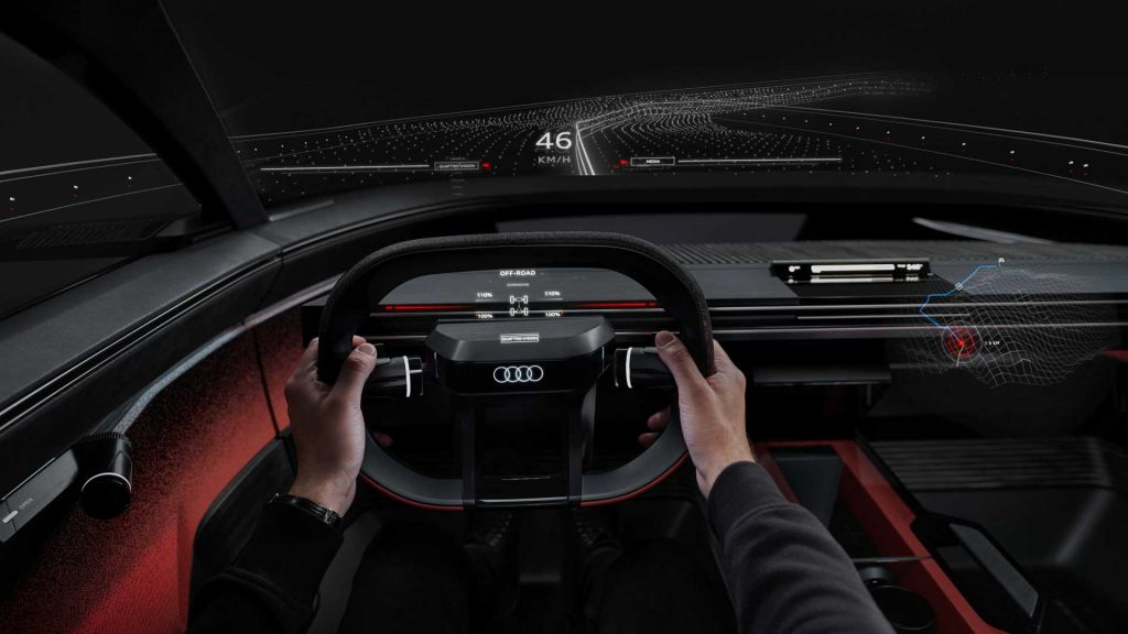 Руль и педали при активации автопилота автоматически убираются, а роль приборной панели выполняет проекционный дисплей. Вместо остального используются очки дополненной реальности. Причем нужный интерфейс отображается при взгляде на соответствующие элементы салона: рядом с дефлекторами возникнет управление климат-контролем, рядом с динамиками — меню аудиосистемы.