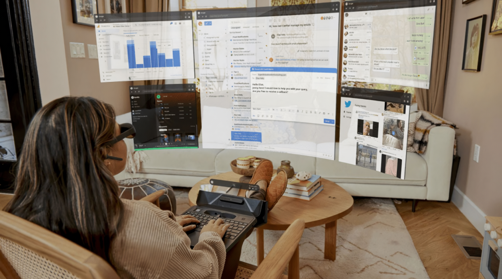 Израильский стартап Sightful представил уникальный ноутбук Spacetop без дисплея. Девайс проецирует 100-дюймовый интерфейс прямо в воздух перед пользователем — увидеть его можно только через специальные очки смешанной реальности.