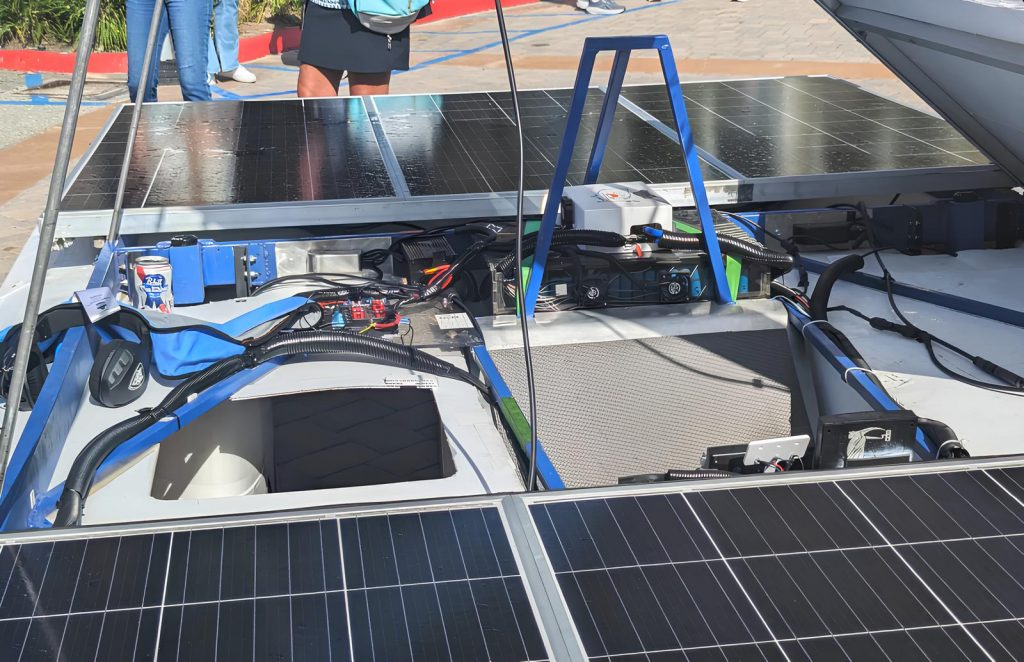 Автомобиль получил название «Солнечный Скиталец». Он отличается уникальным дизайном и продуманной конструкцией. Авто состоит из трубчатого каркаса, гофрированного пластика, деталей, напечатанных на 3D-принтере, самодельного аккумуляторного блока на 320 ячеек, 3 двигателей, 8 солнечных панелей и 3 велосипедных колёс.