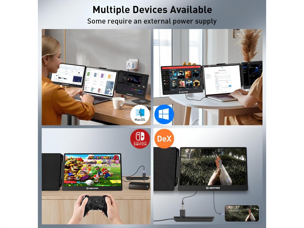 Этот портативный удлинитель совместим с устройствами диагональю от 13 до 17,3 дюймов, включая игровые консоли PlayStation, Xbox и Nintendo Switch, а также устройства на базе Chrome и Linux. Установка драйверов не требуется.