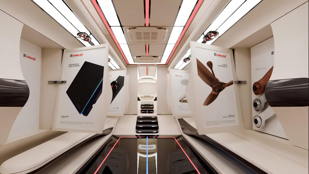 Транспортное средство оборудовано 3 выдвигающимися гидравлическими секциями, создающими дополнительное пространство для демонстрации высокотехнологичной продукции Goldmedal Electricals. Внутреннее освещение автобуса состоит из более чем 10 000 светодиодов с регулируемой яркостью. Также в нём предусмотрены зоны отдыха и мини-бар.