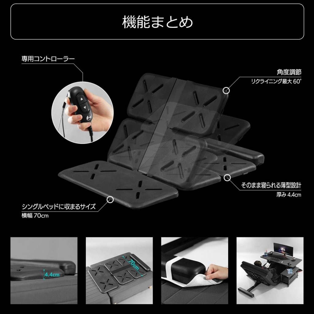 С помощью специального пульта управления пользователи могут регулировать угол наклона изголовья до 60 градусов, что значительно снижает нагрузку на спину и шею во время игр или просмотра контента. Толщина компонентов устройства составляет 7 см, и оно подходит для большинства матрасов, выдерживая нагрузку до 90 кг.