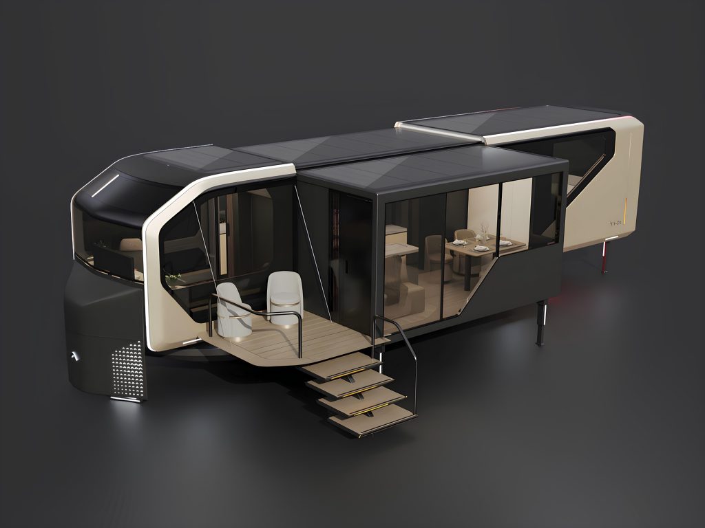 Особое внимание привлёк AI-THd — мобильный дом, способный увеличить площадь почти вдвое. Его корпус длиной 8 м разворачивается в три стороны, создавая просторное жильё площадью около 37 кв. м. В отличие от классических автодомов, у которых выдвигаются лишь стены, здесь трансформация превращает салон в отдельную комнату. Стоимость модели начинается от $328 000 (примерно 26 657 976 рублей).