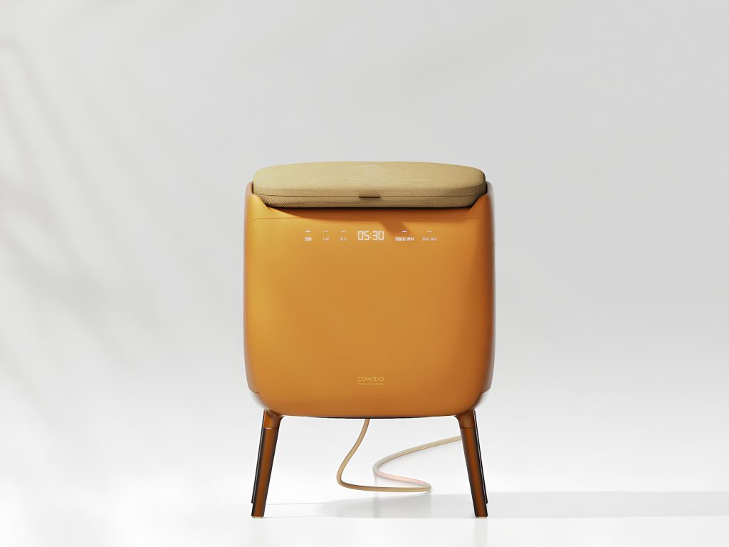Внешне COMODO выглядит как небольшой обитый пуфик на тонких ножках, который органично вписывается в интерьер прихожей. Внутри скрыта камера с тёплым циркулирующим воздухом, «воздушной колодкой», HEPA-фильтром, ароматизирующим модулем и УФ-лампой, за счёт чего обувь не только высыхает, но и очищается от запахов и бактерий. Пара ставится либо на специальные «ножки», либо прямо на основание, а выдвижная платформа облегчает процесс — её удобно подтянуть к себе, чтобы разместить обувь или надеть её, сидя на мягком сидении.