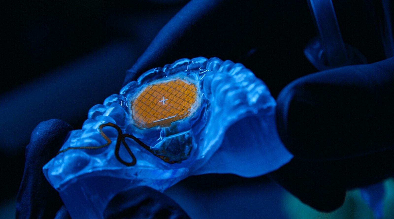 Девайс нужно вставлять в рот. Он изготовлен в форме капы из стоматологической смолы и защищен от слюны.