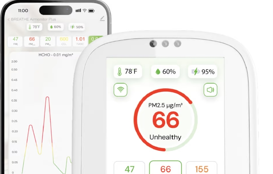 BREATHE Air Monitor Plus — портативный центр анализа качества воздуха для дома и офиса.