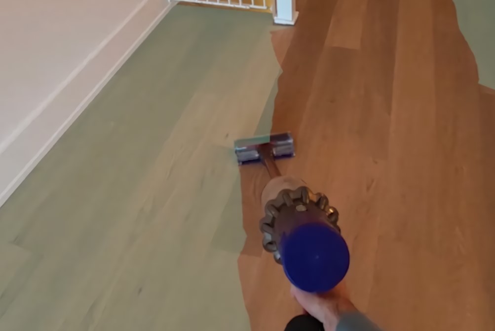 В AR-шлеме пол заливается зеленым цветом, показывая таким образом области, где пользователь еще не пылесосил.