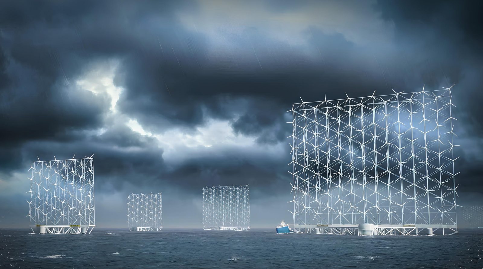 Идея заключается в создании плавучих опор между множеством небольших и легких турбин для равномерного распределения веса и силы ветра.