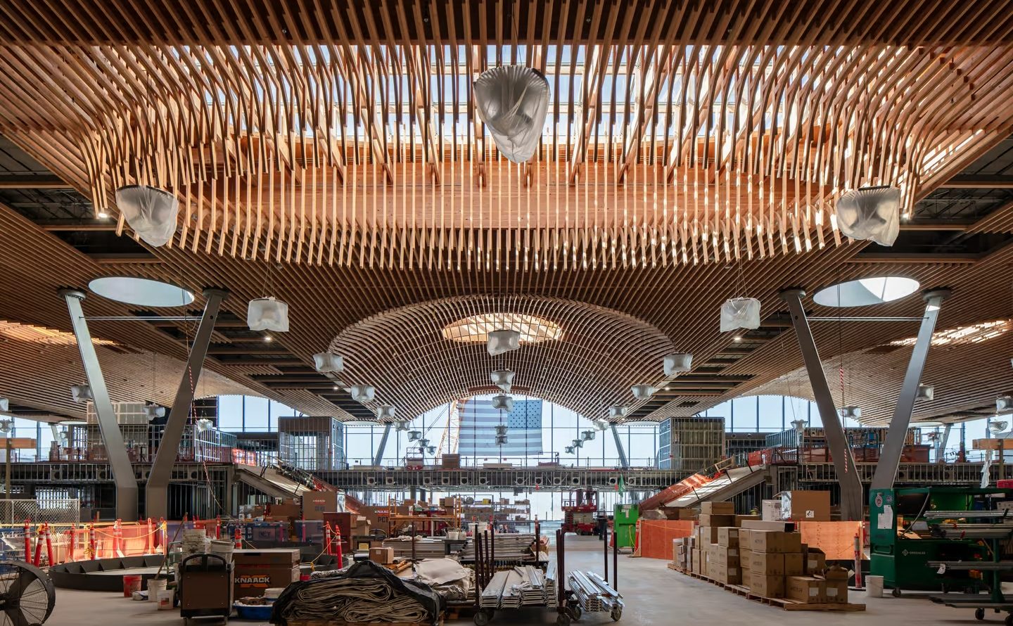 Крыша весит около 8 000 000 кг и состоит из древесины, в том числе из клееного бруса.
