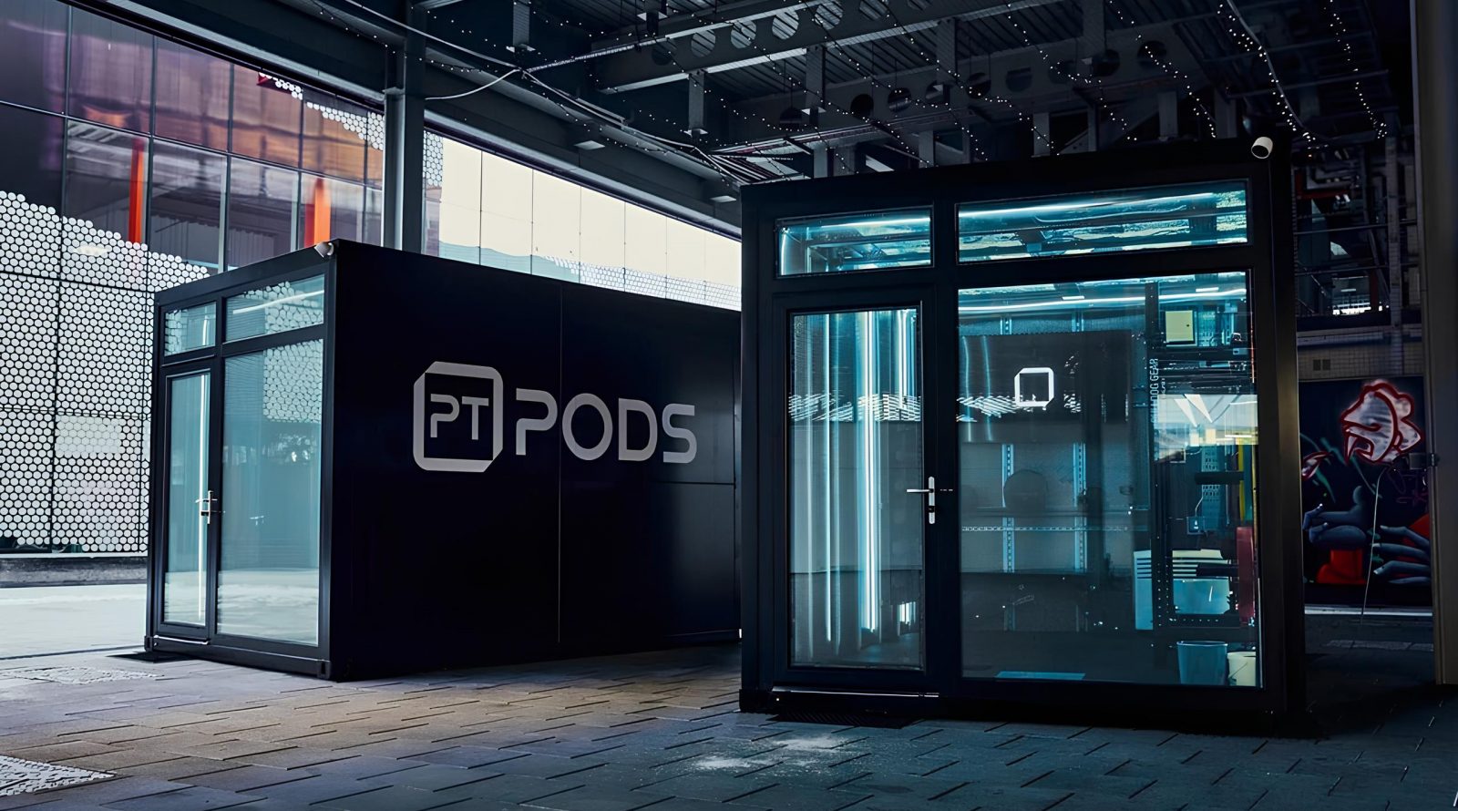Каждый POD оснащён гантелями, тренажёрами и телевизором с виртуальным тренером.