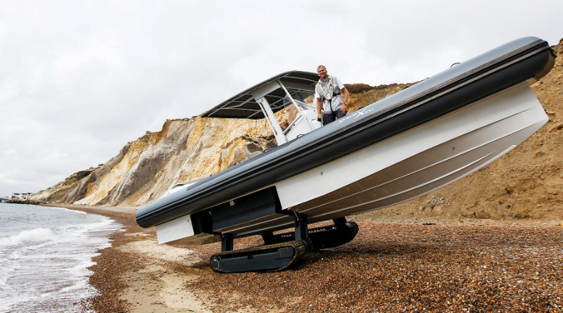 Лодка может выезжать из воды за счет гусениц, как у настоящего танка.
