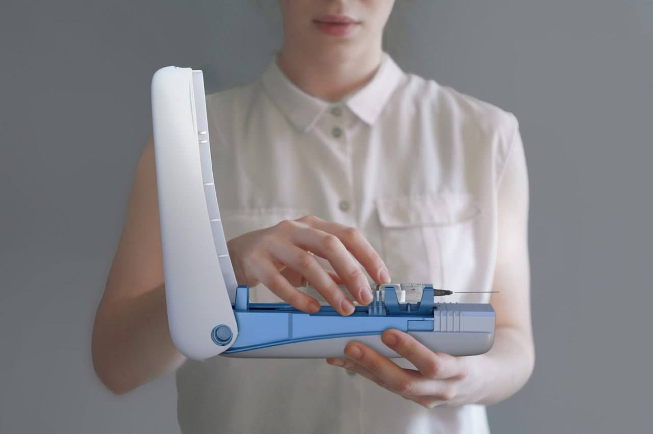 Устройство вводит иглу практически мгновенно, за счет чего снижаются болевые ощущения.